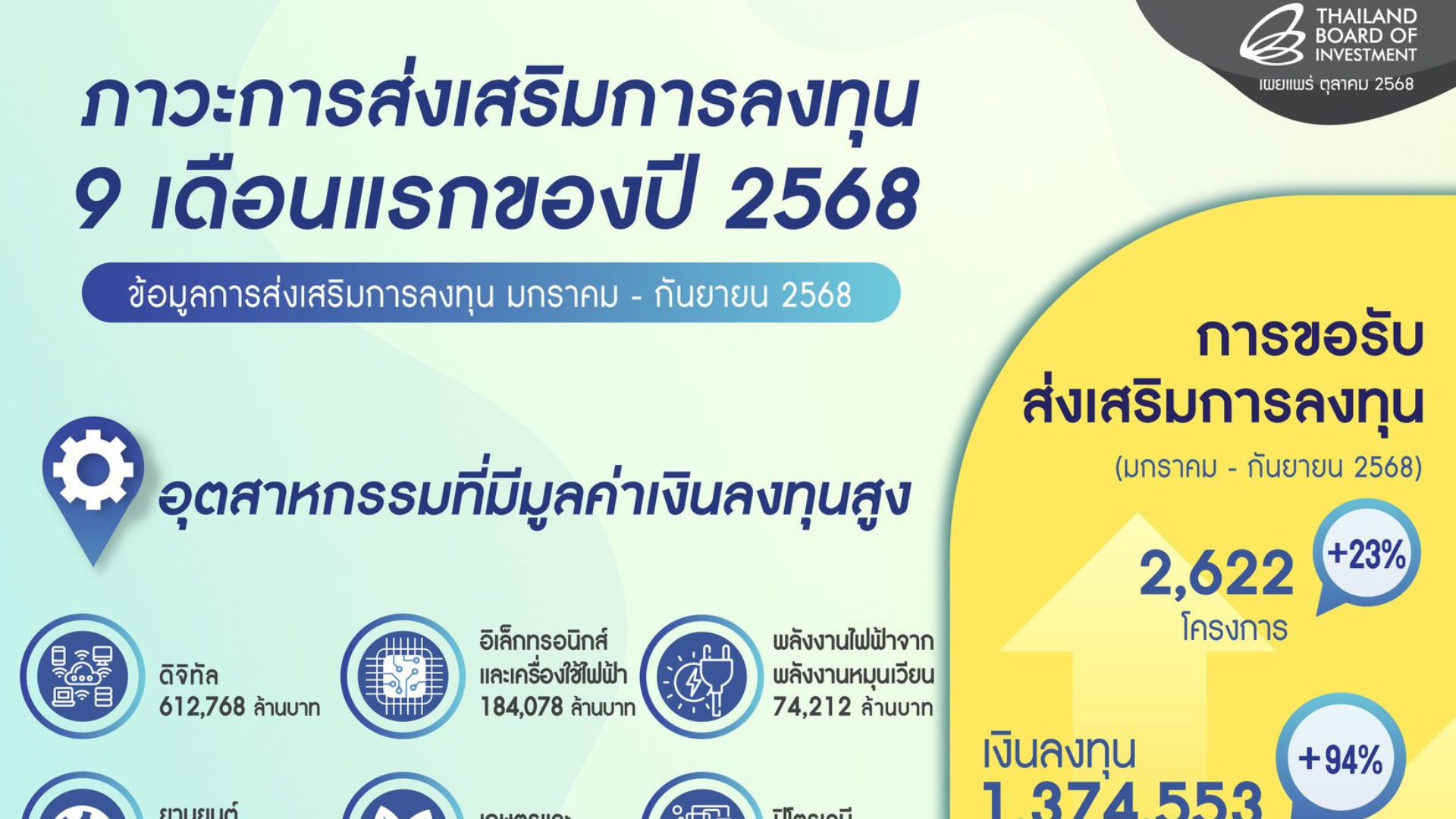 บีโอไอ เผยยอดขอรับการส่งเสริมการลงทุน 9 เดือนแรก ปี 2568 เติบโตเกือบเท่าตัว