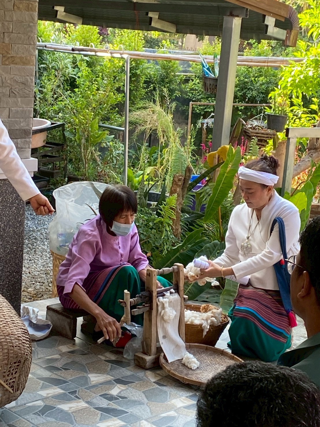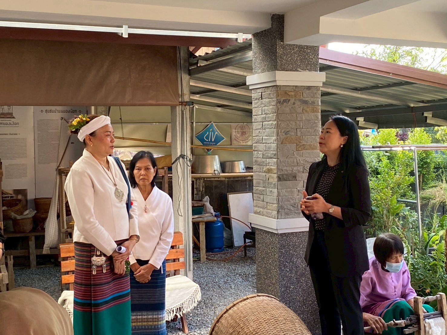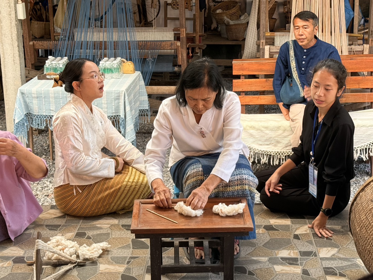 คณะฯ ได้รับฟังการบรรยายจากคุณปทิตตา พรหมสิทธิ์ (แม่หลวงอ้อ) เกี่ยวกับประวัติความเป็นมาและอัตลักษณ์ของชุมชนบ้านหนองเงือก ซึ่งมีชื่อเสียงด้านการทอผ้าฝ้ายพื้นเมืองที่สืบทอดต่อเนื่องยาวนานกว่า 100 ปี โดยเฉพาะลวดลายดั้งเดิมที่สะท้อนอิทธิพลวัฒนธรรมล้านนาและไทยองอย่างชัดเจน